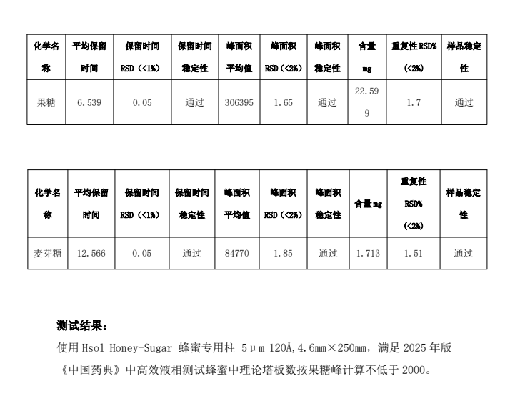 ? 嚴(yán)格契合 2025 版《中國(guó)藥典》標(biāo)準(zhǔn):作為專用中國(guó)藥典蜂蜜檢測(cè)柱子,完全遵循藥典方法開發(fā),分離度、峰形對(duì)稱性、保留時(shí)間穩(wěn)定性及柱效均滿足蜂蜜含量測(cè)定的全部參數(shù)要求,檢測(cè)結(jié)果可直接用于合規(guī)報(bào)告。?