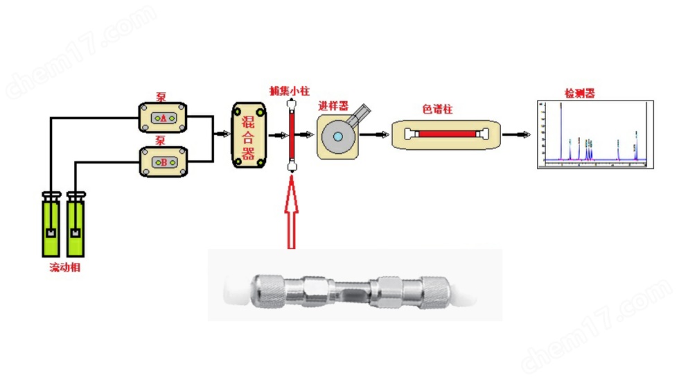 將小柱安裝在梯度混合器和自動(dòng)進(jìn)樣器之間(見(jiàn)圖),不僅能夠去除流動(dòng)相中的雜質(zhì),還可以有效捕集管路和混合器中的雜質(zhì)。