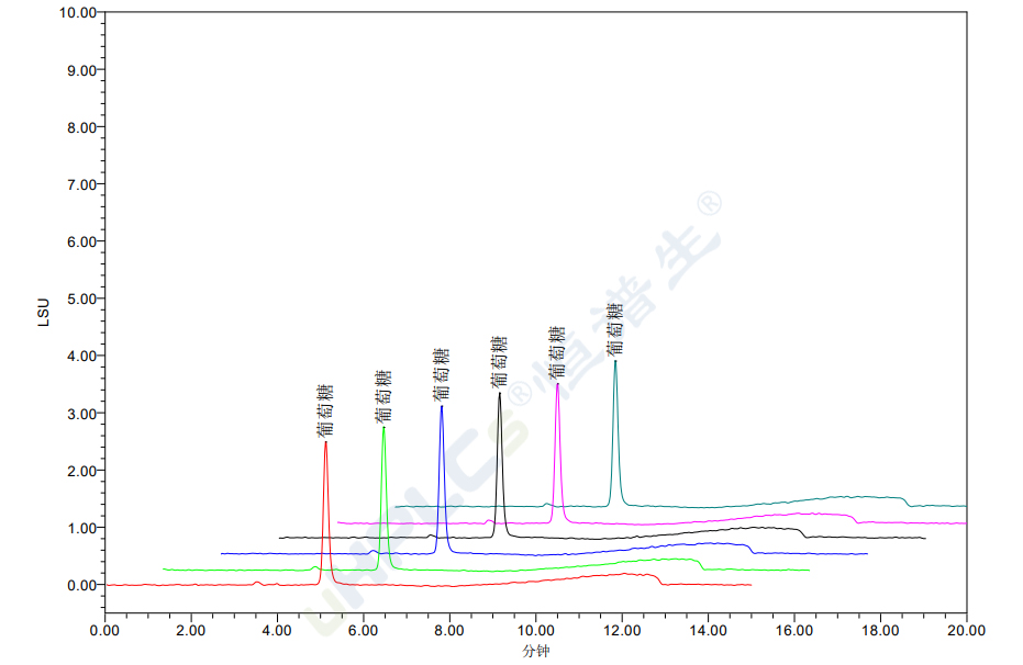 (1)樣品穩(wěn)定性測試:連續(xù)六針5μL?葡萄糖樣品,重復性?RSD?為?1.29%,符合藥典要求。