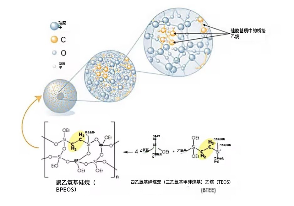 當(dāng)流動相 pH>8 時,硅膠骨架中的硅氧烷鍵(–Si–O–Si–)易發(fā)生水解,導(dǎo)致硅膠基質(zhì)溶解。為拓展色譜柱的 pH 適用范圍,行業(yè)內(nèi)開發(fā)了雜化顆粒技術(shù),其核心是在二氧化硅網(wǎng)狀骨架中引入有機(jī)基團(tuán)(通常為乙基或甲基),形成有機(jī) – 無機(jī)雜化基質(zhì)。